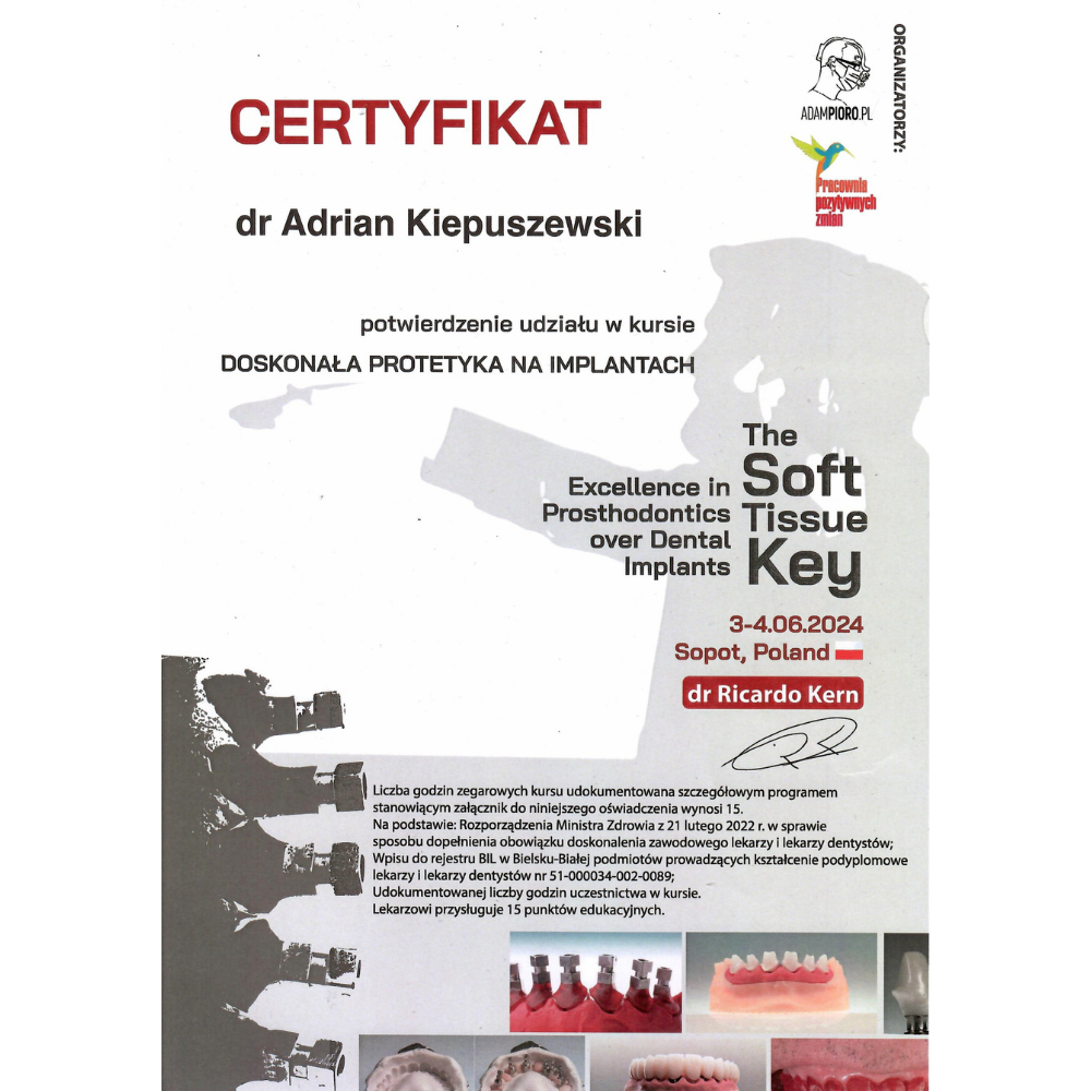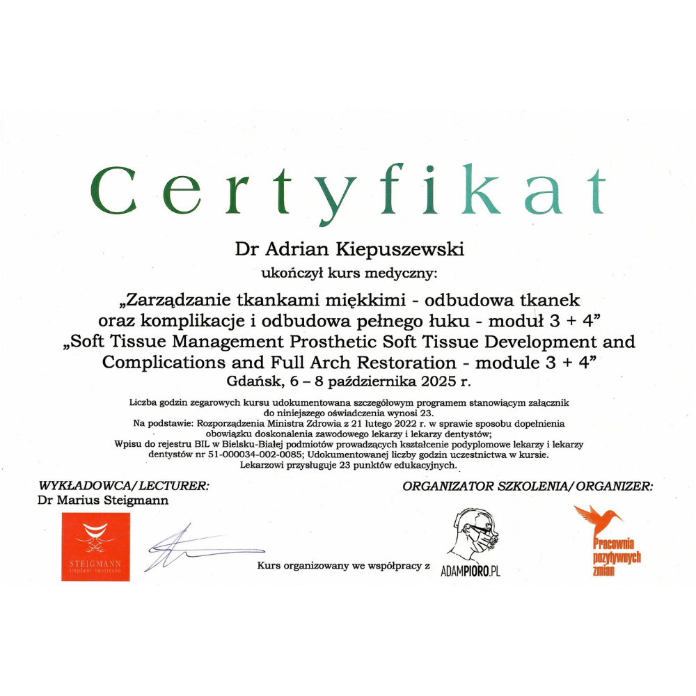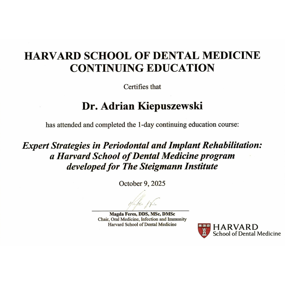 Swoje mistrzostwo w implantologii dr Kiepuszewski rozwijał w ramach curriculum prowadzonego przez prof. Mariusa Steigmann — uznanego autorytetu światowej implantologii, którego podejście do biologii tkanek, precyzyjnego planowania chirurgicznego i estetyki protetycznej wyznacza standardy w branży. Ten zaawansowany program dał mu narzędzia do realizacji najbardziej wymagających rekonstrukcji implantoprotetycznych.