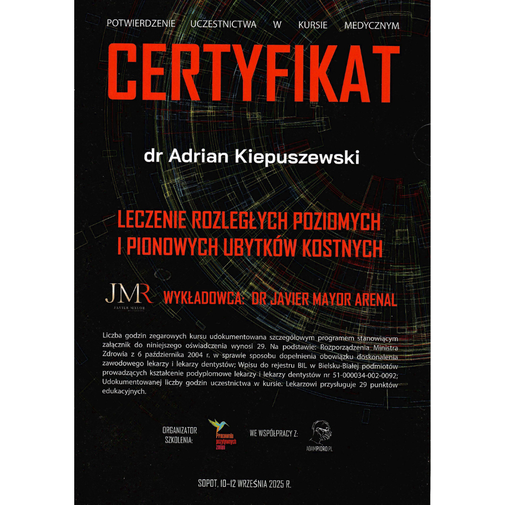 Moje kwalifikacje obejmują m.in. certyfikację Harvard School of Dental Medicine oraz dziesiątki elitarnych szkoleń u najbardziej wpływowych ekspertów implantologii na świecie.