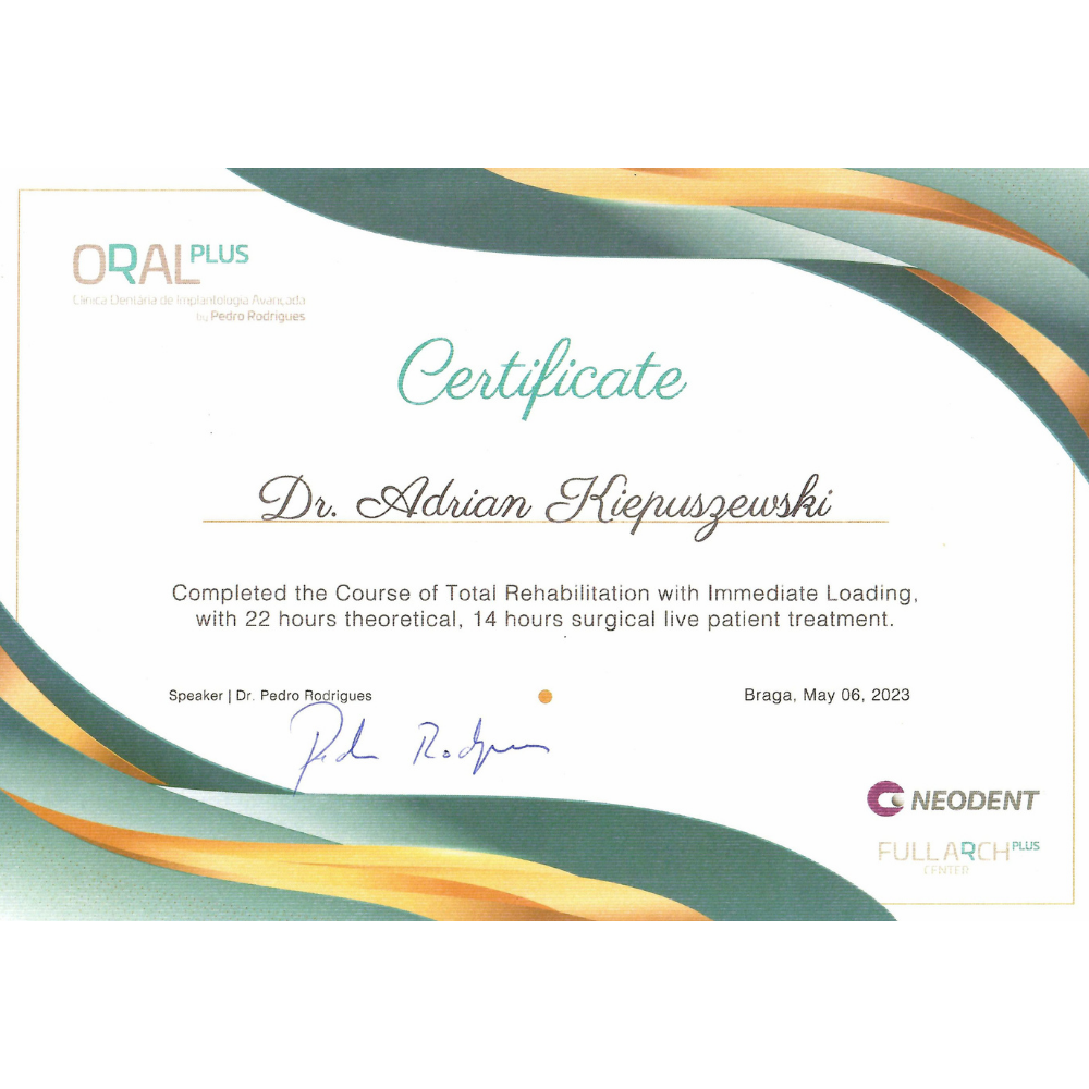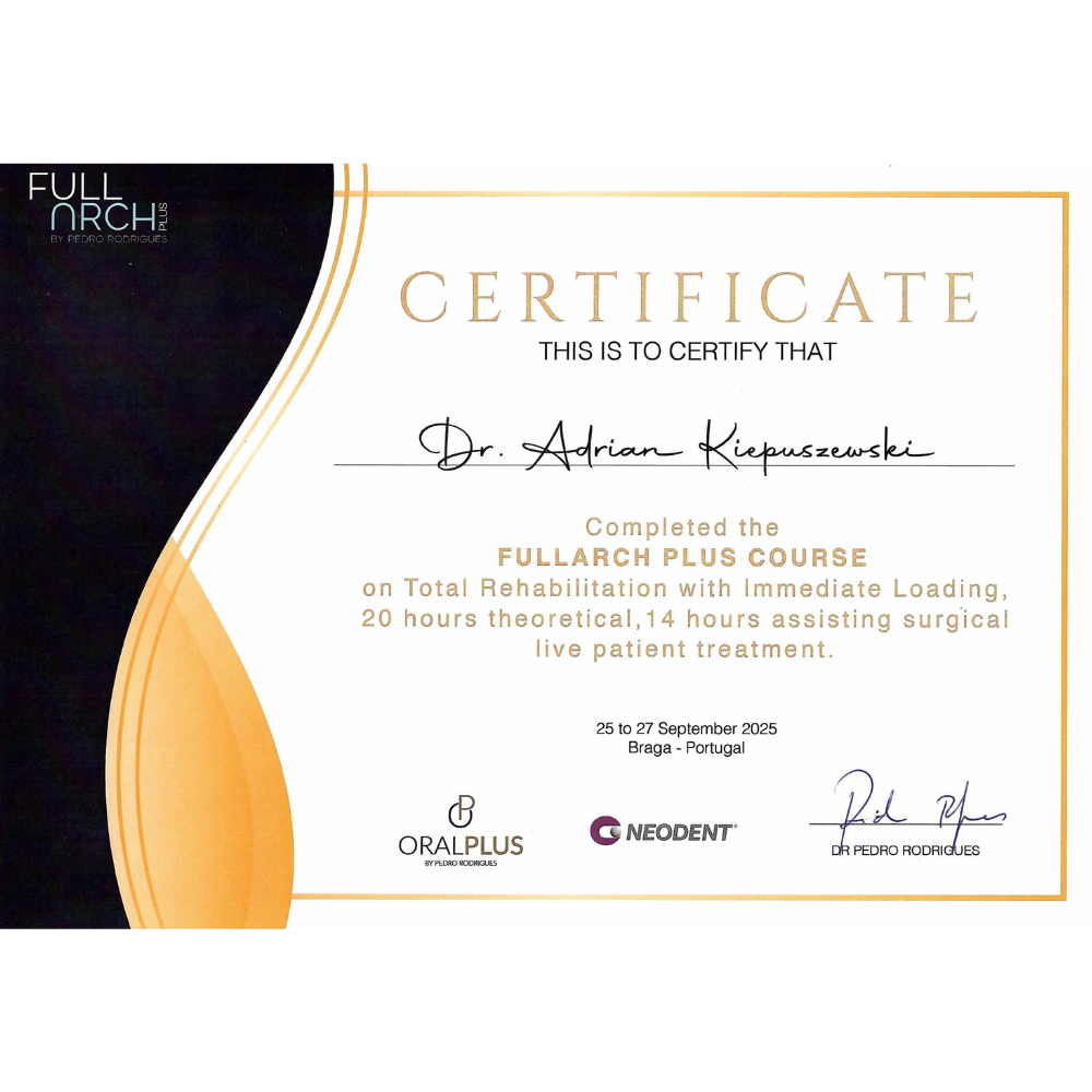 Praktyka dr Kiepuszewskiego to także intensywne szkolenia w całej Europie — od zaawansowanych technik implantologicznych po subtelności protetyki estetycznej. Szczególnym doświadczeniem było szkolenie z procedur All‑on‑X prowadzone przez dr Pedro Rodrigueza w Portugalii — jednego z wiodących ekspertów w tej dziedzinie, cenionego za innowacyjne protokoły natychmiastowego obciążenia, perfekcyjne planowanie chirurgiczno‑protetyczne i przewidywalne, spektakularne rehabilitacje bezzębia. Udział w tych kursach daje dr Kiepuszewskiemu pewność w realizacji kompleksowych, natychmiastowych odbudów o najwyższej estetyce i funkcji.