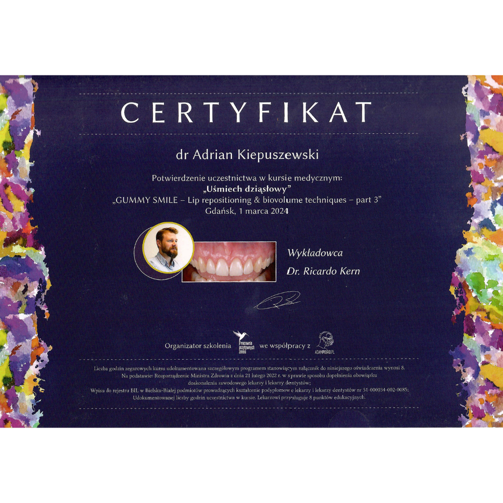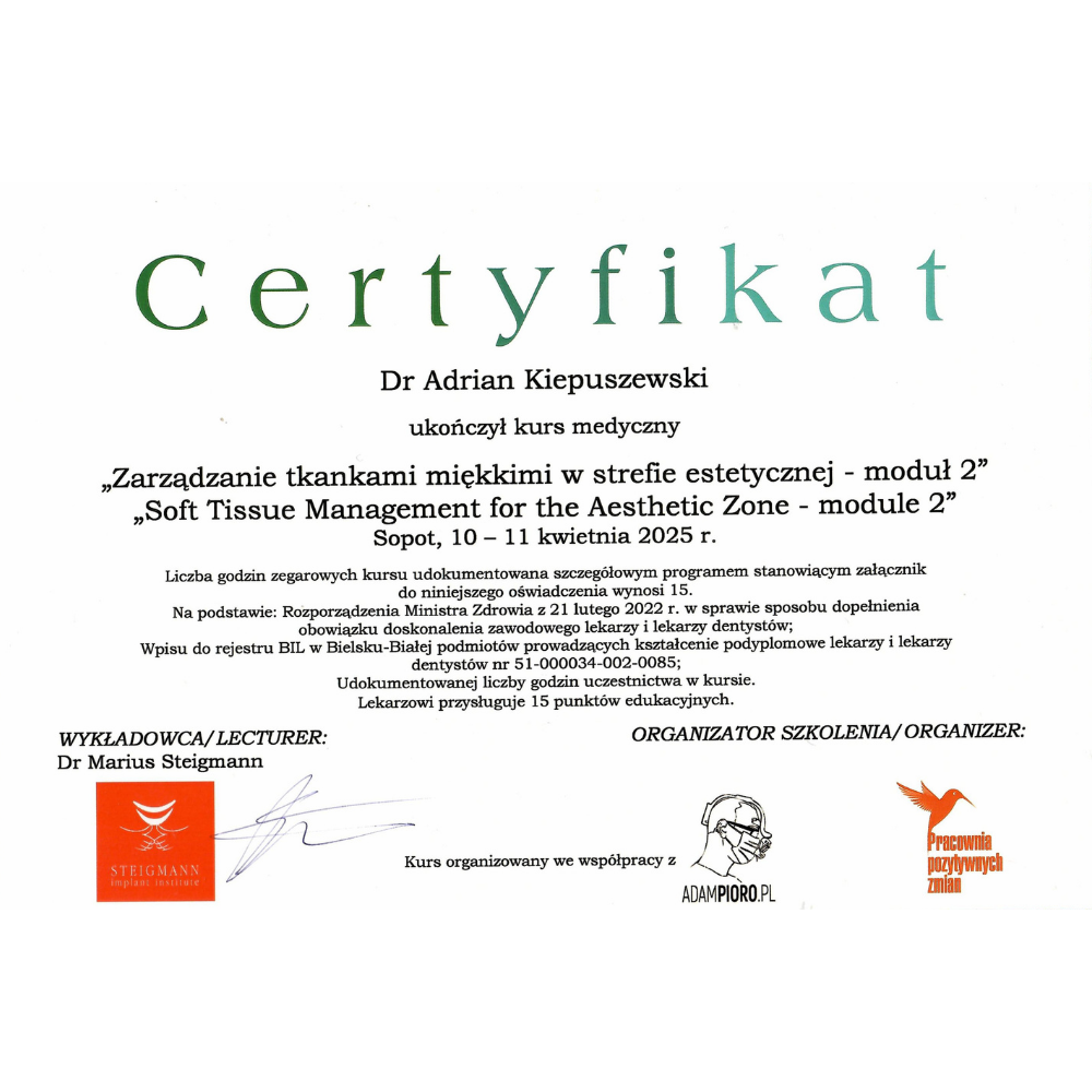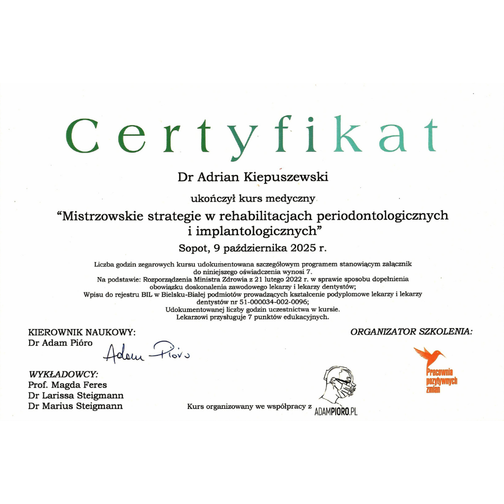 Dr Adrian Kiepuszewski nieustannie podnosi swoje kwalifikacje u najlepszych autorytetów świata, łącząc akademicką rzetelność z praktyką na najwyższym poziomie. Absolwent prestiżowych kursów i certyfikacji, w tym programu Harvard — potwierdzenie zaawansowanej wiedzy i dyscypliny naukowej, które przenoszą się bezpośrednio na jakość opieki w Flow · Dental Studio.